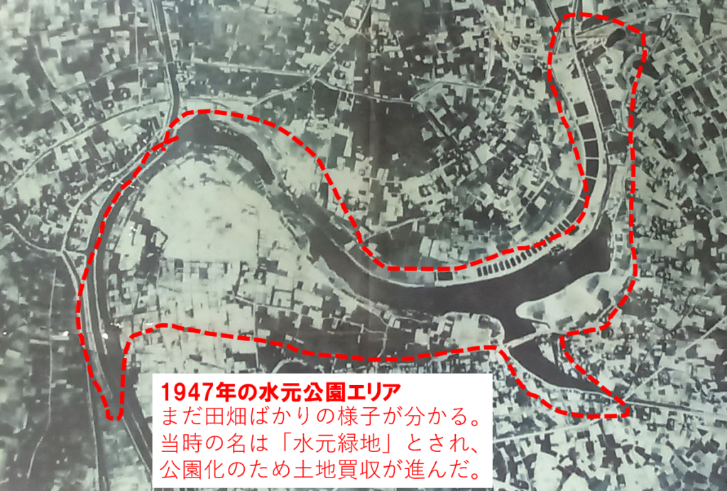 その後第二次世界大戦の戦時下、1940年に「紀元2600年記念事業」(神武天皇即位紀元2600年を祝った一連の行事)の一環で「水元緑地」として公園化計画が始まりました。下の写真は土地買収が進められている途中で、後の中央広場にあたる場所にはまだまだ畑の区画が見られます。