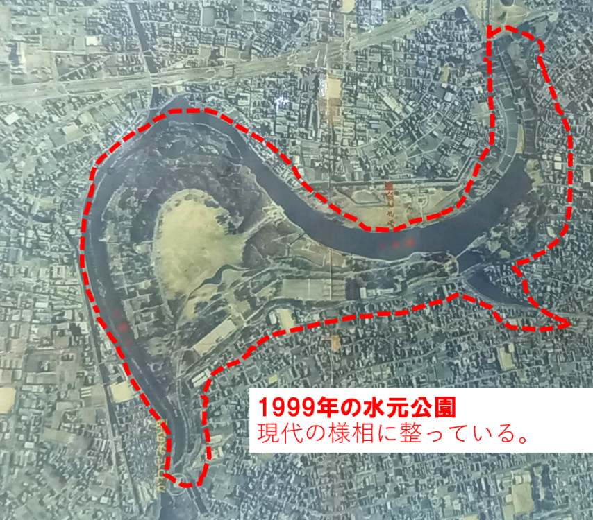 公園一帯はもともと河川敷で、公園を囲む桜並木の道が堤防だった! かつての小合村の人たちががんばって埋め立てて耕作地にしたらしい