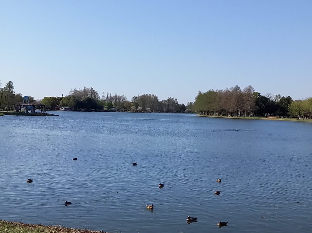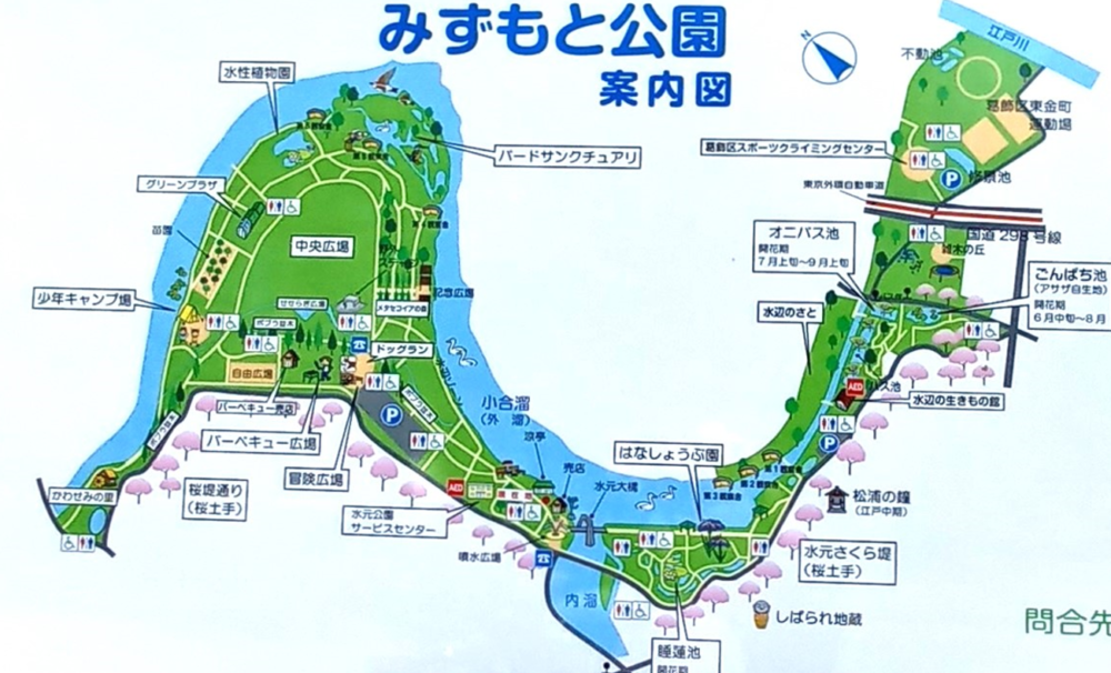 公園一帯はもともと河川敷で、現在公園を囲む桜並木の道が河川の堤防だった! 400年前ほどに堤防内側をかつての小合村の人たちががんばって埋め立てて耕作地にしたらしい。その後スゴ腕の治水家・井沢弥惣兵衛が川の入り口と出口をちょん切って、公園中央の大きな池「小合溜井」を作ったらしい