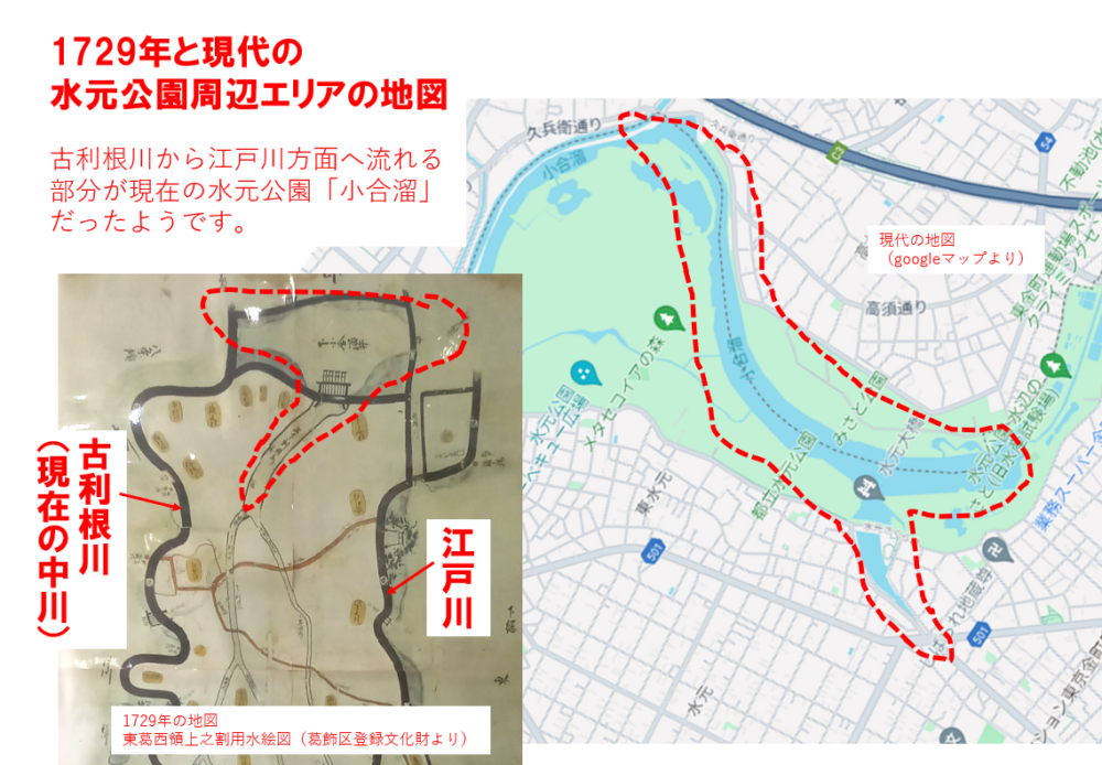 その後1729年、徳川第八代将軍・徳川吉宗の時代に、幕臣・井沢弥惣兵衛(いざわやそべえ)が、この川の古利根川からの入り口、および江戸川方面への出口、この二つを完全に塞ぎ、遊水池としたものが小合溜井の原型です。当時流域にあった上小合村、下小合村に多く接していたため「小合溜」と呼ばれるようになりました。ちなみに当時の地図にうっすらと現在の水元公園の姿を見ることができます。下に飛び出た現在の内溜め池あたりから灌漑用水が流れ出て、広く田畑を潤した様子が想像できますね。