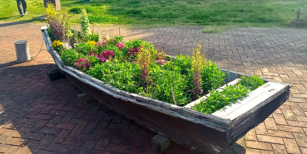 昔小合溜で使われていたボートでしょうか。現在はプランターとして活躍してくれています。