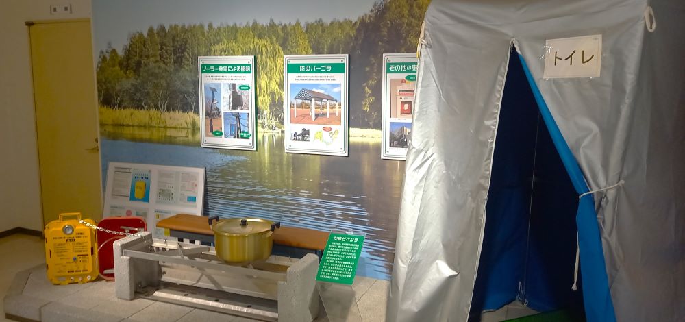 水元公園全体が地元水元地区の避難場所に指定されています。その中でもグリーンプラザ裏にはマンホールトイレの準備があるようで、ハザードマップにも名称が記載されています。