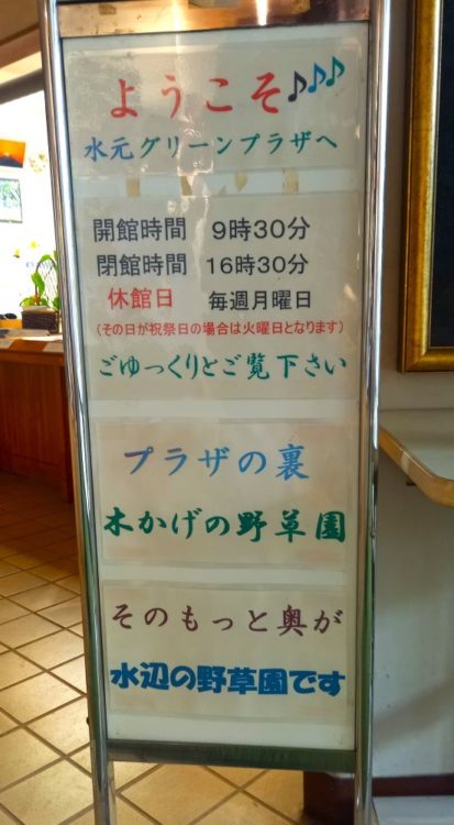 入ってすぐに案内板がお出迎えしてくれます。グリーンプラザの裏には「木かげの野草園」、さらにその奥が「水辺の野草園」と教えてくれます。