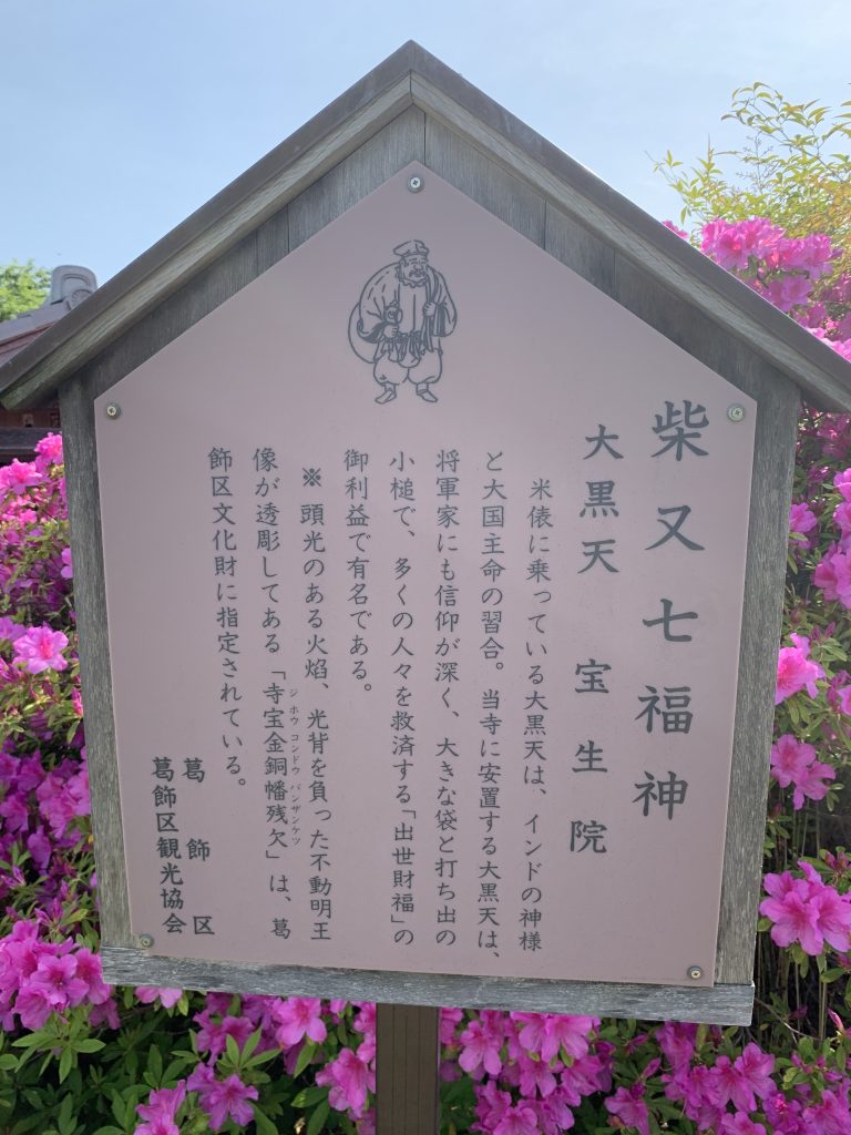 正式名称は「大黒山宝生院」(寺号はなし)で、真言宗智山派の寺院です。1624年、柴又ではなく現在の中央区京橋に常陸国大聖寺末宝性院として創建。その後現在の台東区谷中、同池之端茅町を経て、関東大震災で被災ののち1927年(昭和2年)当地葛飾区柴又へ移転しました。柴又七福神のうち、インドの神様と日本古来の大国主命(オオクニヌシノミコト)の習合と言われる大黒天を祭っています。南葛八十八ヶ所霊場の50番、御府内二十一ヶ所霊場21番札所です。