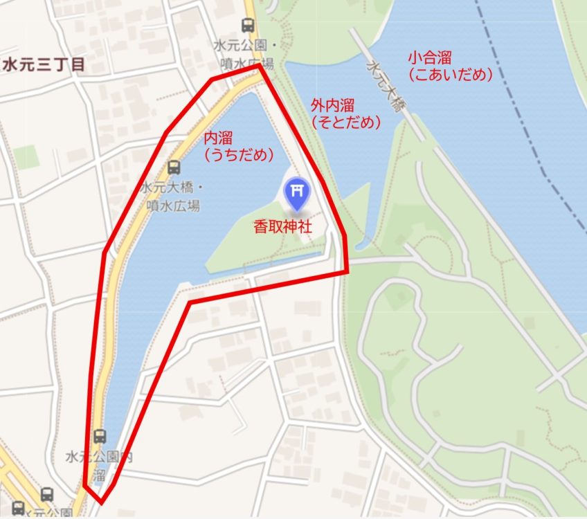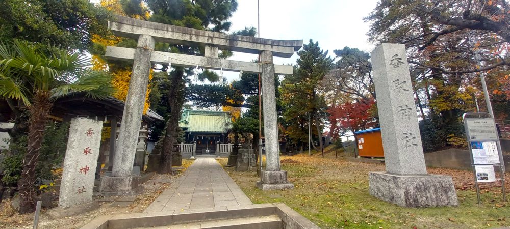 創建年代は不明ながら、全国にある香取神社の総本社・千葉県の香取神宮と関係が深く、香取神宮より分霊(ぶんれい)を勧請(かんじょう)したもの(=神様に「こちらの神社にも分身としてこちらの神社に恒久的にお越しください」とお願いして、来てもらった)といわれており、そのため歴史・格式としても一定の正統性がある神社のようです。水辺に囲まれ切り取られたような神社です。道路一本を隔て水元公園のすぐ外に位置するのでぜひ立ち寄ってみてください。