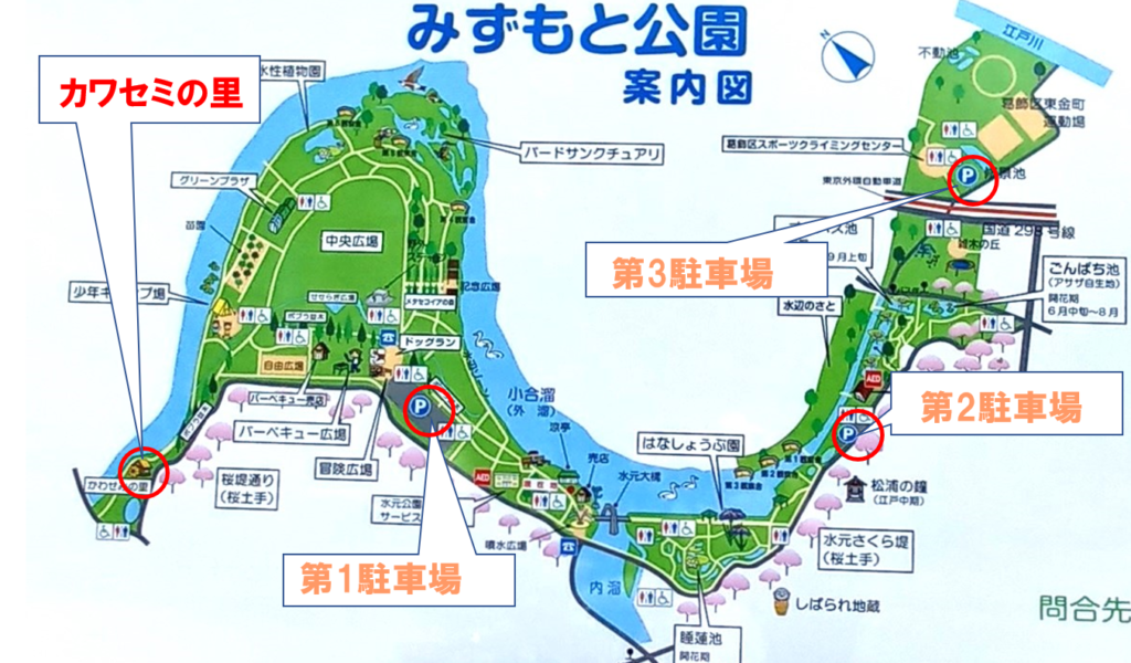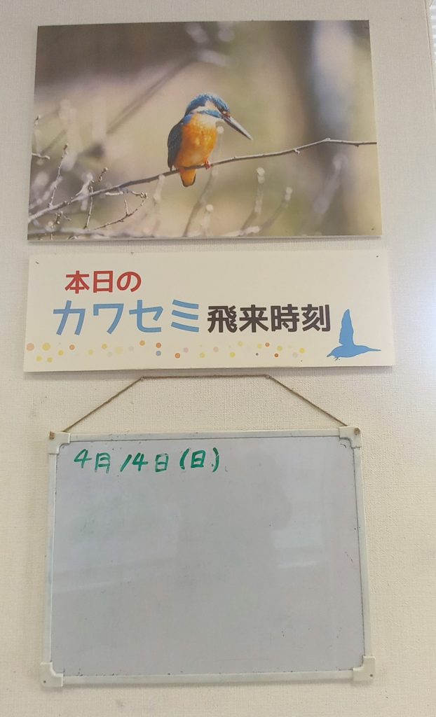 カワセミの里は、カワセミがよくやって来る池を中心とした一部のエリアの名称です。中心には「水元小合溜水質浄化センター」の建物があり、その一部が「水辺のふれあいルーム」として一般に開放されています。この「水辺のふれあいルーム」からは大きな窓を通して外の池を眺められ、タイミングがよければ飛来したカワセミを見ることができます。カワセミを待って長い時間座って池を眺められるようイスもたくさん置いてあり、カワセミが来ると「あそこにカワセミがいる!」「どこどこ?!」などとみんなで色めき立つのも愉しみの一つです。
