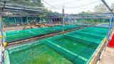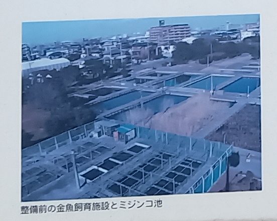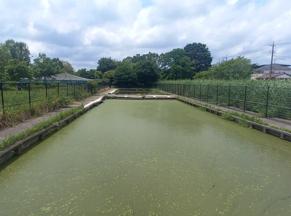 金魚の餌となるミジンコを養殖しているミジンコ池。金魚は10日に一回の割合で産卵し、一回の産卵につき1000~3000の卵を産みます。金魚では生後1日~2日後からミジンコを餌として与えなければなりませんが、その量は稚魚の3~4倍! 1日一回、生後2週間目くらいまで毎日与えるそうです(施設看板より)