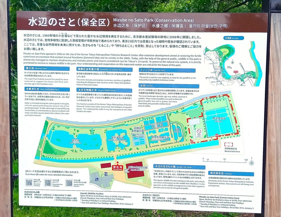 1960年頃の小合溜(公園中央の大きな溜池)などで見られた豊かな水辺環境を再生するために、東京都水産試験場の跡地に2006年に開園しました。金魚展示場、復元池、水質浄化池など6つほどのエリアで構成されています。