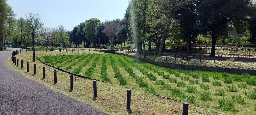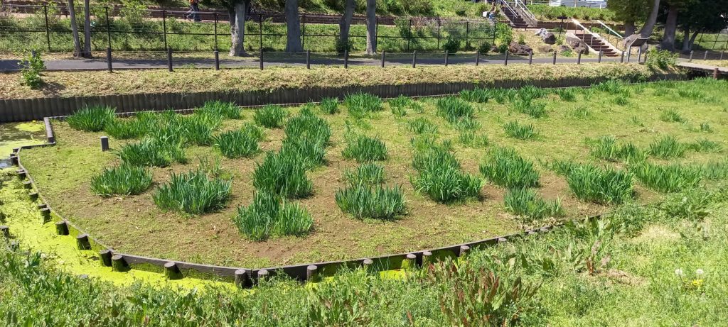 4月のはなしょうぶエリアはまだまだ緑だけ。5月下旬から一斉に花を咲かせます。