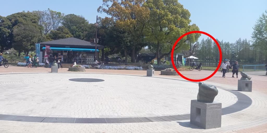 噴水広場の売店に向かって右奥が貸し出し場所です。