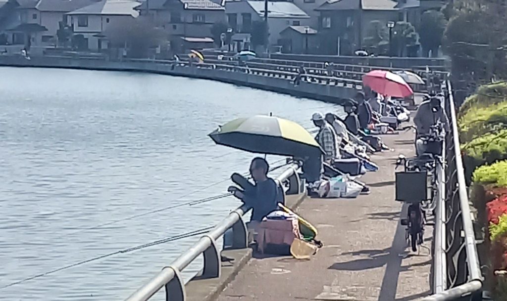 その歩道に沿って釣り人もぐるりと溜め池を囲んでいます。水深は3mほどとのこと。